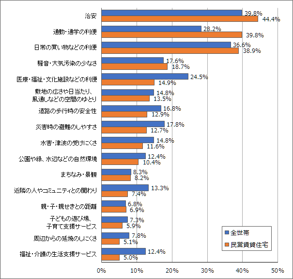 一方で、「医療・福祉・文化施設」や「近隣の人やコミュニティとの関わり」などについては、全世帯に比べて割合が低く、民営賃貸住宅では比較的重視されていない。