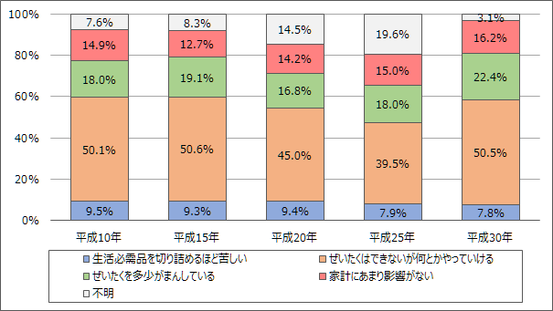 借家における住居費負担に対する評価を見ると(図5)、「ぜいたくはできないが、何とかやっていける」が50.5%と最も高く、次いで「ぜいたくを多少がまんしている」が22.4%、「家計にあまり影響がない」が16.2%、「生活必需品を切りつめるほど苦しい」が7.8%となっている。