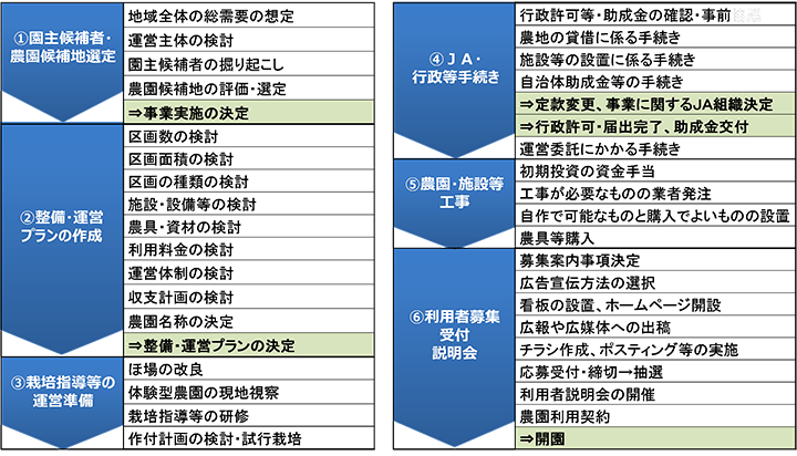 一部運営主体や貸借の有無等の違いによって若干異なるものの、体験型農園の流れは概ね下図のとおりとなる(図表6)。