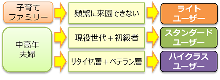 体験型農園の主なターゲット層は、子育てファミリーと中高年夫婦で、子育てファミリーはその多くがライトユーザーであり、中高年夫婦はさらにスタンダードユーザーとハイクラスユーザーの2つに分かれる。想定ユーザー層によって求める農作業の負荷や来園頻度が異なるため、それぞれに応じた区画面積や品目数等の求められるサービスを対応させる必要がある(図表5)。