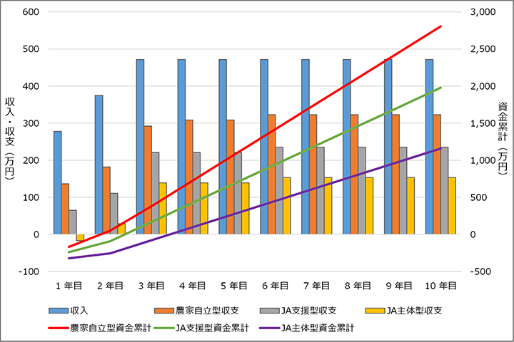 | JA主体型 | 人件費:142万円 3年目(基準年)収支:138万円 資金回収:4年目 |