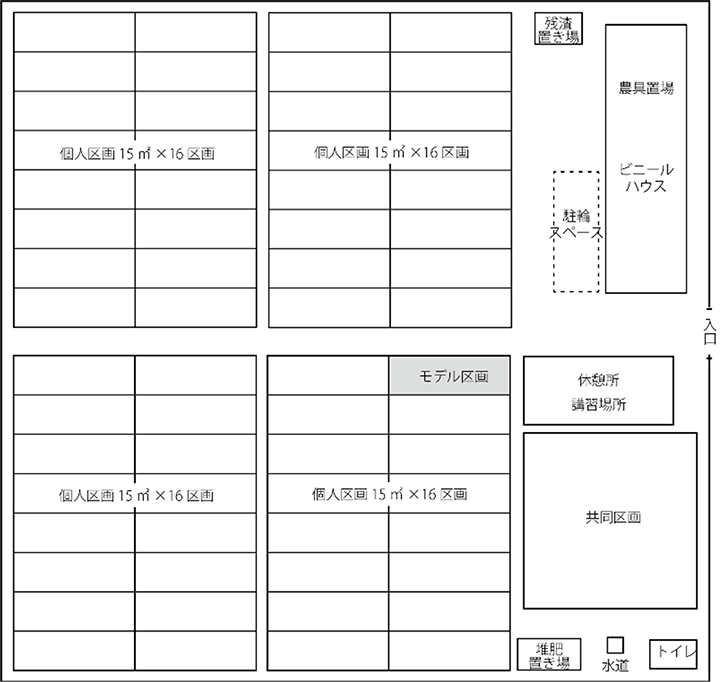 | ■要件1:定期的な栽培指導や収穫体験を行う 定期的に栽培講習会や収穫イベントを開催するなど、年間を通した食や農に関する体験を行う。 ■要件2:農作業に必要件な設備や農具を設置し、種苗や資材を提供する 農作業をするために必要な給水等の設備や農具を設置し、種苗や肥料・農薬その他の生産資材を提供する。 ■要件3:利用者の交流イベントを行う 利用者同士の交流や、多様な食や農に関するイベントを行う。 |