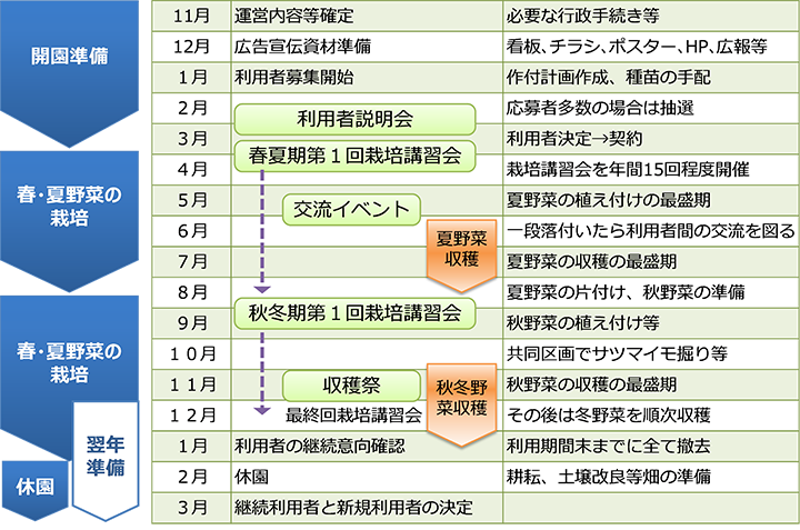 体験型農園の1年の運営の流れを示すと概ね下図のようになり、これを毎年繰り返す(図表13)。
