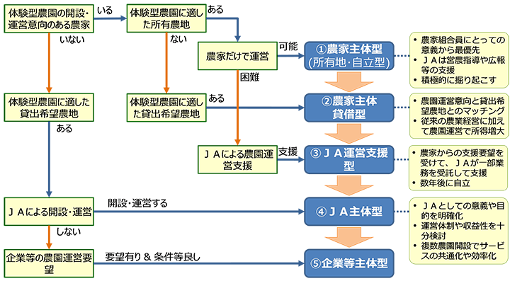 また、開設運営主体が農家またはJA、農地を貸借する場合には特定農地貸付または都市農地貸借円滑化法といった活用する貸借制度によっても、体験型農園を類型化できる。