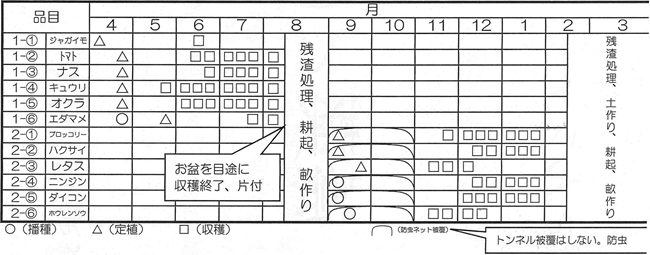 初年度の個人区画での栽培品目数は、春夏期が6品目、秋冬期が7品目で、年間13品目となっている。利用者の作業の様子や収穫量を見る限り、このくらいの品目数が適当とJAではみている。ただし、キュウリなど一部の品目では、果実の穫れすぎや収穫期を逃しがちなどの問題がある。