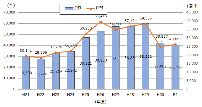 一方、件数は前年度比4.7%増加しているものの、1件当たりの貸出額が6,344万円で前年度比8.8%減となったために、合計の貸出額は減少となった(各年集計)。